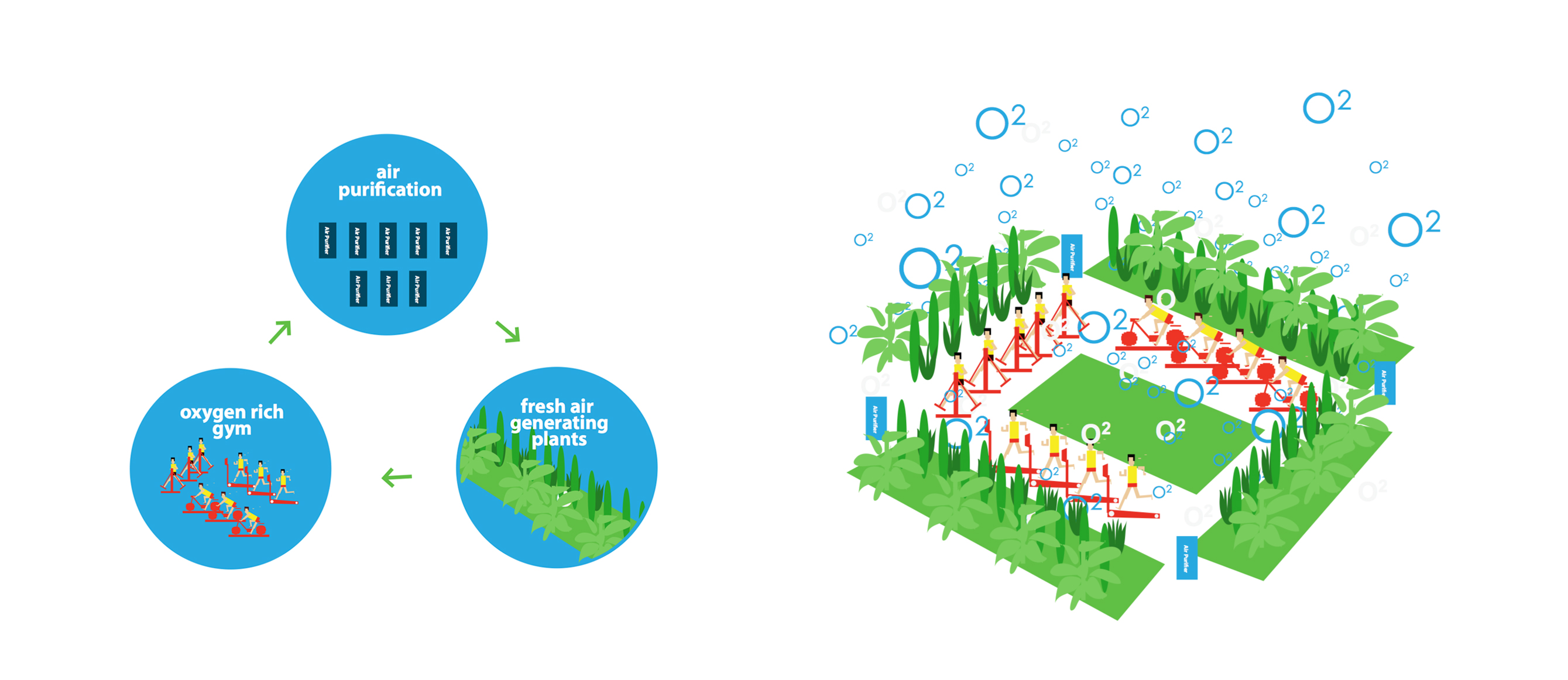 生态智能氧泡作为北京设计周主题展览”智慧城市”的重 点展览单元,是交互北京2013 “我们的空气”主题下的示 范项目的概念原型装置。 本装置包含人力发电空气净化、绿植生态空气净化以及空 气质量监测可视三个系统。在装置中我们采用改造升级过 的社区健身器材, 通过人力发电来驱动空气净化装置,来实 现空气净化;三种绿色植物持续制造新鲜空气;空气质量 监测可视系统将实时并对比展示氧泡内外的空气质量和 pm2.5值。 本装置将这三个系统有机构成,形成生态智能 富氧区。本示范项目展示了通过大众参与自下而上地来改 善城市空气环境的可能性。